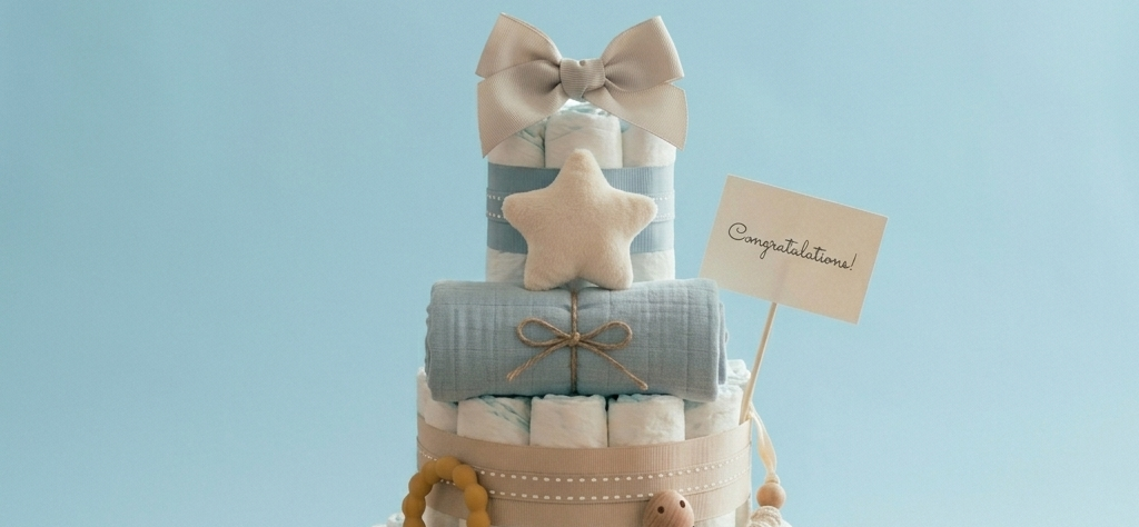 おむつケーキとは、おむつがケーキのような形にデコレーションされたギフトのこと。